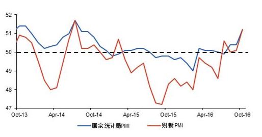 具體來看,10月官方制造業(yè)PMI從9月的50.4反彈至51.2,財新制造業(yè)從9月的50.1上升至51.2%,官方與財新兩大PMI指數(shù)均創(chuàng)逾兩年高位。