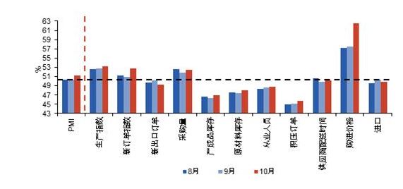 按不同分類指數(shù)來看,新訂單分項指數(shù)從9月的50.9上升至52.8,但新出口訂單則下滑至49.2,顯示當(dāng)前國內(nèi)需求要明顯好于海外。生產(chǎn)指數(shù)為53.3,為連續(xù)3個月上升,且該指數(shù)創(chuàng)下了2014年10月以來的最高值。此外,與大宗商品價格上漲呼應(yīng),10月購進價格指數(shù)大幅上漲至62.6,是自2011年4月以來的最高水平。