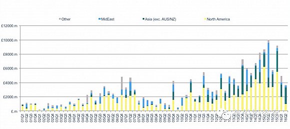 從2001年到2016年的對英投資中,中東投資者一直表現(xiàn)穩(wěn)健,北美投資者走勢和英國地產(chǎn)的經(jīng)濟周期幾乎一致,亞洲投資者(包括經(jīng)濟騰飛的中國在內(nèi))對英投資一直呈上升趨勢。