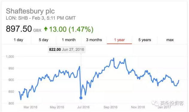 Shaftesbury股價(jià)在2016年6月23日英國(guó)脫歐公投結(jié)果出來(lái)后遭遇暴跌,從每股958.5便士暴跌至每股822便士,加上同時(shí)英鎊貶值,形成了一個(gè)難得的入手窗口期,李德義也成功利用這段窗口期買(mǎi)下了Shaftesbury16%的股權(quán),目前Shaftesbury股價(jià)已經(jīng)慢慢回升到897.50。