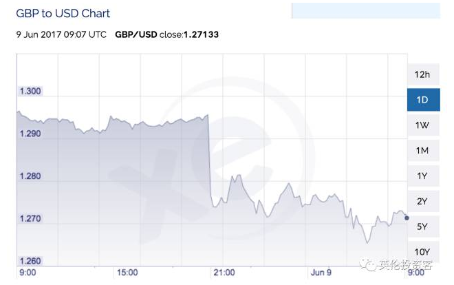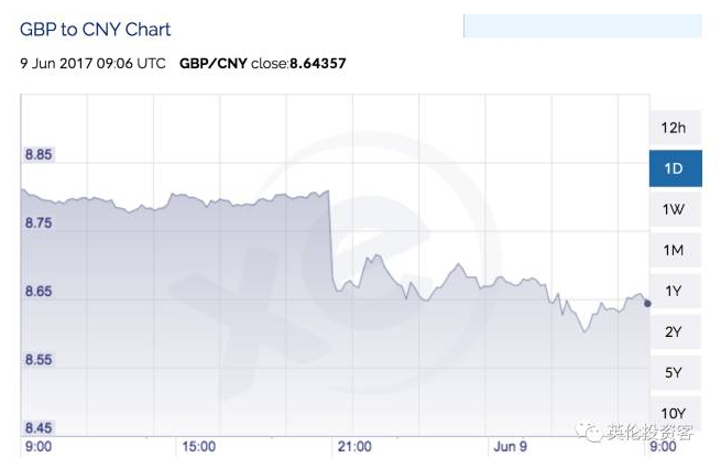 受其影響,英鎊大幅下跌,截止英國(guó)時(shí)間2017年6月9日10點(diǎn)(北京時(shí)間17點(diǎn)),英鎊兌人美元匯率已經(jīng)跌到1.27,兌人民幣匯率已經(jīng)跌到8.64。