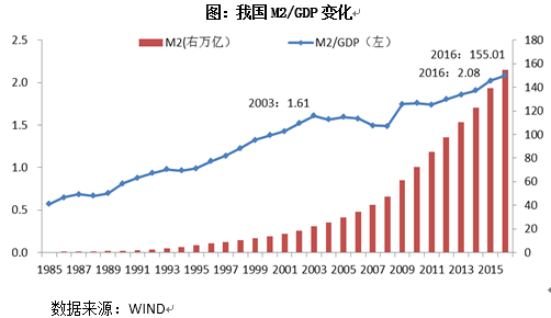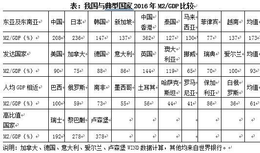 從國(guó)家來看,2016年,我國(guó)M2/GDP為208%,只低于日本的236%、盧森堡的378%,顯著高于絕大部分國(guó)家的水平。