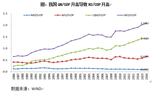 M1/GDP較為穩(wěn)定,M1占M2比例在減小,狹義貨幣沒有大量快速增加。數(shù)據(jù)顯示,1986-2016年,我國(guó)M2/GDP由65%上升至208%,上升速度比較快。從貨幣結(jié)構(gòu)的角度看,M2是由不同交易動(dòng)機(jī)貨幣部分組成,現(xiàn)金和活期存款對(duì)應(yīng)交易動(dòng)機(jī)部分,準(zhǔn)貨幣對(duì)應(yīng)財(cái)富貯藏動(dòng)機(jī)部分。M0/GDP、M1/GDP比值較為平穩(wěn),沒有出現(xiàn)明顯的上升或下降的變化趨勢(shì),變化較為平緩,表明隨著GDP規(guī)模的擴(kuò)大,經(jīng)濟(jì)活動(dòng)的增加,M1既有效滿足了經(jīng)濟(jì)交易活動(dòng)對(duì)貨幣的需求,又沒有出現(xiàn)明顯的過剩。另外,M1/M2在逐漸下降,表明在M2中M1部分占比在減少。因此,狹義貨幣M1沒有大量快速增加。