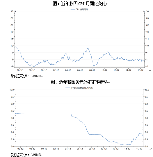 貨幣超發(fā),就是貨幣供給量超過貨幣需求量,將引起貨幣貶值,對(duì)內(nèi)貨幣貶值就是發(fā)生顯著通貨膨脹,對(duì)外貨幣貶值就是外匯匯率走高、人民幣匯率下降,因此CPI、匯率是衡量貨幣是否超發(fā)的有力工具指標(biāo)。近年來,我國(guó)CPI大多數(shù)月份在2%附近,自1996年1月以來,CPI月均值為2.2%,遠(yuǎn)低于新興經(jīng)濟(jì)和發(fā)展中經(jīng)濟(jì)體的8%,與發(fā)達(dá)經(jīng)濟(jì)體2%左右的通貨膨脹相當(dāng)。伴隨著廣義貨幣M2的大規(guī)模擴(kuò)張,中國(guó)物價(jià)指數(shù)變化總體溫和,并沒有出現(xiàn)人們所擔(dān)心的物價(jià)大幅上漲的情況,尤其是2011以來CPI變化基本平穩(wěn)并保持在較低的水平。