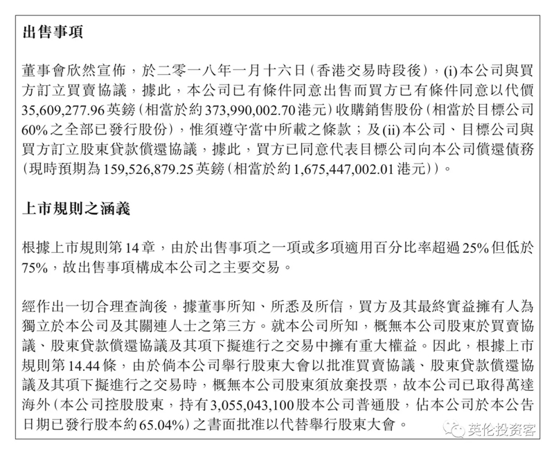 如圖所示,“倫敦ONE”項(xiàng)目另外40%掌握在未上市的萬(wàn)達(dá)香港公司手上,也在這次一并出售,每股價(jià)格與公司出售每股銷售股份的價(jià)格相同,博主按比例計(jì)算約為16.55億港元,買家將為“倫敦ONE”100%股份支付至少41.38億港幣(約合35億人民幣)。