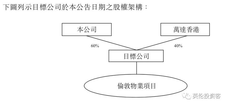 萬(wàn)達(dá)在公告里還公布了項(xiàng)目出售架構(gòu),圖中的目標(biāo)公司持有萬(wàn)達(dá)“倫敦ONE”項(xiàng)目永久業(yè)權(quán)及土地開(kāi)發(fā)權(quán)等權(quán)益。