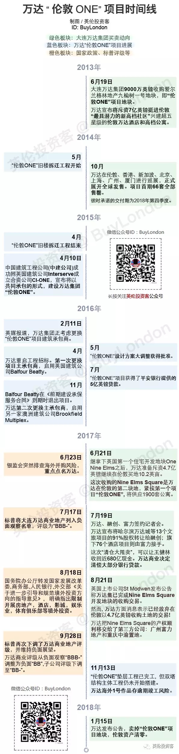 折騰了四年多,萬(wàn)達(dá)終于拋掉了鬧心的“倫敦ONE”項(xiàng)目,項(xiàng)目經(jīng)歷了兩次更換承包商,工期延誤,可謂一波三折,博主之前做過(guò)一張萬(wàn)達(dá)“倫敦ONE”項(xiàng)目的時(shí)間線,可以很直觀看出項(xiàng)目所經(jīng)歷的各種波折。