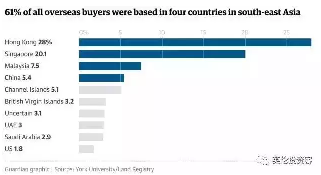 圖為按國籍統(tǒng)計的倫敦房產(chǎn)海外投資客排名:香港(28%)、新加坡(20.1%)、馬來西亞(7.1%)、中國大陸(5.4%)分列一到四位