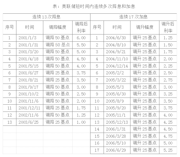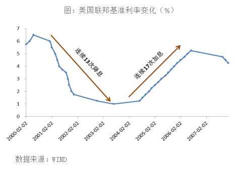 美國(guó)2007年次貸危機(jī)爆發(fā)之前貨幣政策經(jīng)歷了由持續(xù)極度寬松到驟然收緊的轉(zhuǎn)變過程。2000-2004年間,為應(yīng)對(duì)新經(jīng)濟(jì)泡沫破滅和“9.11”事件的影響,美聯(lián)儲(chǔ)實(shí)行了極度寬松的貨幣政策,2年多時(shí)間連續(xù)13次降息,將基準(zhǔn)利率從6.5%調(diào)低至1%,且將1%的基準(zhǔn)利率保持了一年多。在此期間,美國(guó)房地產(chǎn)市場(chǎng)迅速發(fā)展,房?jī)r(jià)大幅上漲,通貨膨脹明顯。為管理通貨膨脹,從2005年開始兩年半的時(shí)間內(nèi),美聯(lián)儲(chǔ)先后17次加息,將利率從1%調(diào)高到5.25%,隨著利率的上調(diào),房?jī)r(jià)開始出現(xiàn)降溫調(diào)整以致急劇下降。
