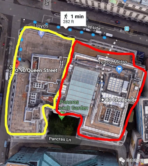 上圖左側(cè)黃框?yàn)槟县S剛買的90 Queen Street大樓,右邊紅框?yàn)橹百I的80 Cheapside大樓