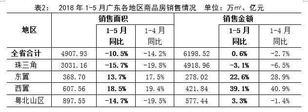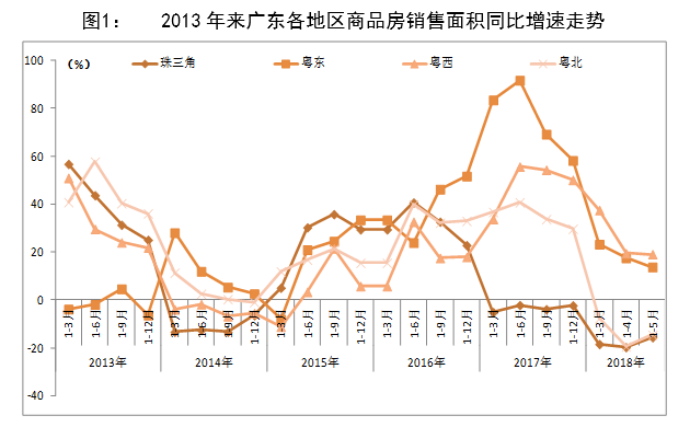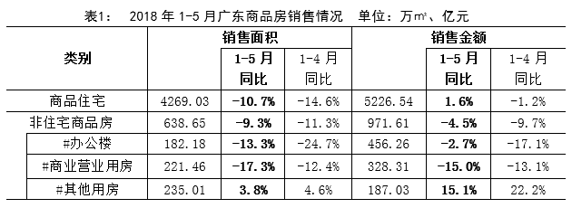 2018年1-5月,廣東商品房銷售面積4907.93萬平方米,同比下降10.5%,降幅較1-4月收窄3.7個百分點;銷售金額6198.52億元,同比增長0.6%,較1-4月提高3.3個百分點;商品房銷售均價12630元/平方米,同比上漲12.3%。