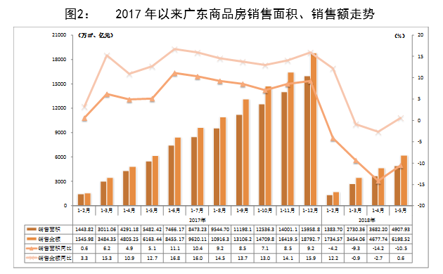 分區(qū)域看,珠三角地區(qū)商品房銷售面積3031.16萬平方米,銷售金額4918.96億元,同比下降15.7%和3.1%;銷售均價16228元/平方米,同比上漲14.9%?;洊|西北商品房合計銷售面積1873.81萬平方米,銷售金額1277.29億元,同比分別下降0.8%和增長17.3%,銷售均價6817元/平方米,同比上漲18.2%。數(shù)據(jù)顯示,東西兩翼銷售量同比增速持續(xù)回落,珠三角和粵北地區(qū)降幅有所收窄。