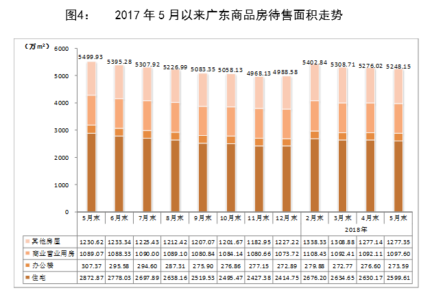 從庫存情況看,截至2018年5月期末,廣東商品房待售面積5248.15萬平方米,其中商品住宅待售面積2599.61萬平方米。與2017年末相比,商品房待售面積增加259.57萬平方米,其中住宅增加184.86萬平方米。