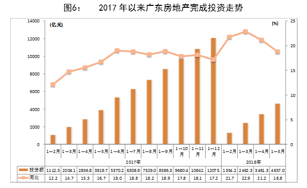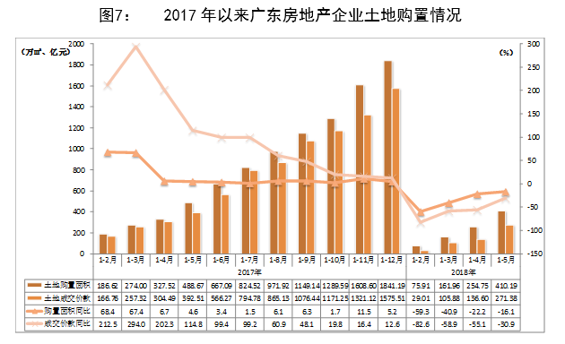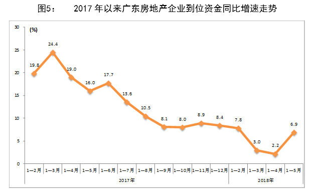 1-5月,在調控政策日益嚴厲的背景下,廣東商品房銷售面積、銷售額同比增速呈現(xiàn)逆勢反彈,凸顯調控政策仍有進一步完善的空間;企業(yè)資金狀況有所改善,房地產完成投資、新開工面積同比增速繼續(xù)回落,土地購置面積和成交價款同比降幅持續(xù)收窄,反映企業(yè)對后市謹慎樂觀。