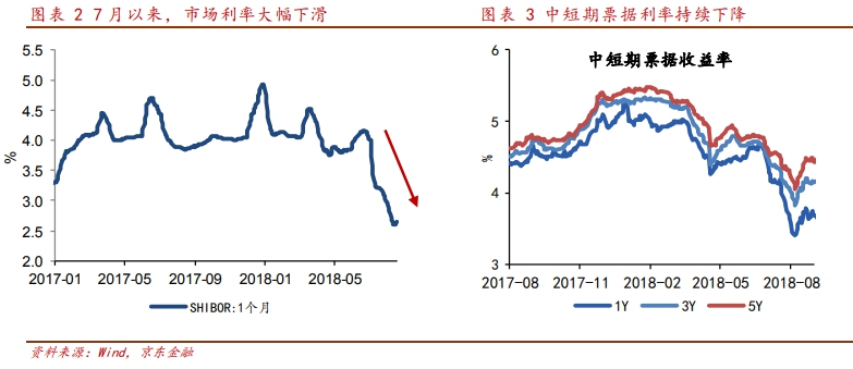 今年上半年,伴隨著去杠桿與財政緊約束的推進,中國宏觀經(jīng)濟出現(xiàn)明顯回落。與此同時,中美貿(mào)易戰(zhàn)風險也在加大。為應對內(nèi)憂外困局面,7月以來,中國貨幣政策迎來邊際放松,市場流動性偏緊的情況得到明顯緩解,貨幣市場利率大幅下滑。從1個月期限的Shibor來看,利率自6月高點4.15%回落至當前的2.65%,下降了1.5個百分點。