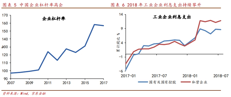 2008年之前,中國非金融企業(yè)杠桿率一直穩(wěn)定在100%以內(nèi),全球金融危機后,加杠桿趨勢非常明顯,非金融企業(yè)杠桿率由2008年98%上升到2016年的158%,在全球范圍內(nèi)處于較高水平。伴隨著2017年中國的去杠桿政策,企業(yè)杠桿率持續(xù)攀升的局面有所遏制。同時,去杠桿背景下,企業(yè)利息支出增長較快,從2017年開始,工業(yè)企業(yè)利息支出持續(xù)增長,特別是2018年前三個月,利息支出同比增速均超過10%,還債負擔增加明顯。