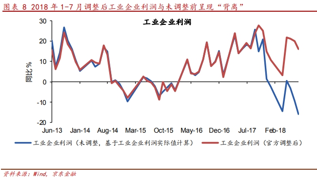 在我們看來,當前銀行放貸意愿下降與實體經(jīng)濟活力有限,與缺少投資回報率較高的項目有關。伴隨著中國經(jīng)濟回落,去杠桿、加強環(huán)保、企業(yè)稅收負擔加重、人力成本增加等原因,當前中國企業(yè)盈利情況面臨困境。而房地產(chǎn)市場的一枝獨秀,也推升了租金成本,對其他行業(yè)發(fā)展造成了負面沖擊。從工業(yè)企業(yè)利潤來看,今年以來根據(jù)工業(yè)企業(yè)利潤計算的同比增速快速下降,7月下降幅度為16%,而統(tǒng)計局調整后的工業(yè)企業(yè)利潤今年以來與之出現(xiàn)明顯偏差,二者背離,說明統(tǒng)計數(shù)據(jù)的可信性存在商榷。如果以大規(guī)模工業(yè)企業(yè)退出規(guī)模以上企業(yè)的統(tǒng)計口徑作為解釋,恰恰說明,企業(yè)運行存在困難,規(guī)模以上企業(yè)數(shù)量明顯減少的事實。