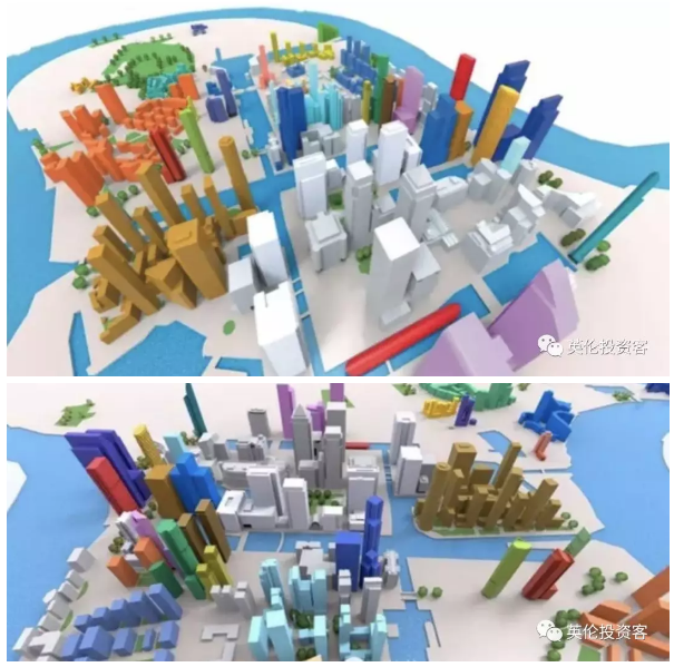 圖為金絲雀碼頭未來摩天高樓效果圖,圖中白色模型為已有建筑,彩色為在建、規(guī)劃獲批待建或已經(jīng)規(guī)劃待批的項目。