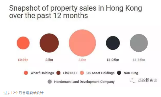 上圖看出,香港過去一年最大的地產(chǎn)賣單由李嘉誠旗下長實創(chuàng)造,賣了約40英鎊的香港房產(chǎn)。
