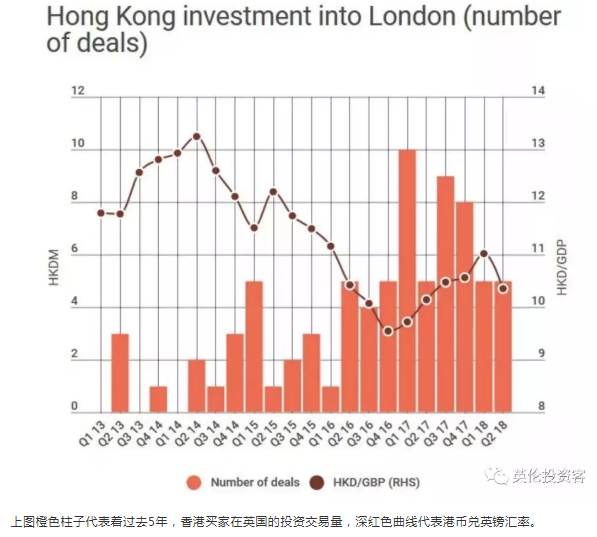 上圖橙色柱子代表著過去5年,香港買家在英國的投資交易量,深紅色曲線代表港幣兌英鎊匯率。