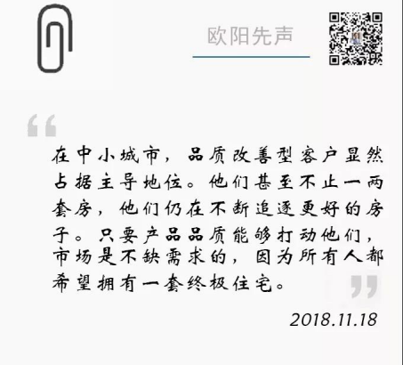 在中小城市,品質(zhì)改善型客戶顯然占據(jù)主導地位。他們甚至不止一兩套房,他們?nèi)栽诓粩嘧分鸶玫姆孔?。只要產(chǎn)品品質(zhì)能夠打動他們,市場是不缺需求的,因為所有人都希望擁有一套終極住宅。