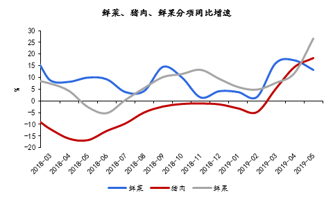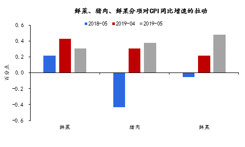 5月CPI同比增速2.7%,漲幅較4月增加0.2個(gè)百分點(diǎn),符合預(yù)期。翹尾因素貢獻(xiàn)1.5個(gè)百分點(diǎn),新漲價(jià)因素貢獻(xiàn)1.2個(gè)百分點(diǎn)。鮮果和豬肉是推升5月CPI的主要原因。5月食品價(jià)格同比上漲7.7%。其中,由于供應(yīng)減少,鮮果價(jià)格處于歷史高位,同比上漲26.7%,影響CPI上漲約0.48個(gè)百分點(diǎn);豬肉價(jià)格上漲18.2%,影響CPI上漲約0.38個(gè)百分點(diǎn)。而鮮菜大量上市,價(jià)格漲幅比上月回落4.1個(gè)百分點(diǎn)至13.3%,影響CPI上漲約0.31個(gè)百分點(diǎn)。5月非食品價(jià)格同比上漲1.6%,較4月略降0.1個(gè)百分點(diǎn)。其中,受成品油調(diào)價(jià)等因素影響,交通和通信價(jià)格同比下降0.9%。