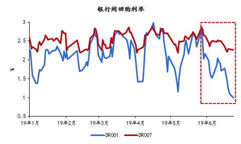 沈建光 中國貨幣網(wǎng)數(shù)據(jù)顯示,6月24日上午11點(diǎn)DR001(銀行間存款類機(jī)構(gòu)隔夜質(zhì)押式回購利率)報(bào)價(jià)為0.9940%,DR007報(bào)價(jià)(銀行間存款類機(jī)構(gòu)7天期質(zhì)押式回購利率)2.2309%,其中DR001跌破1%,創(chuàng)歷史新低。作為反映銀行體系流動(dòng)性松緊狀況的核心指標(biāo),DR001和DR007的大幅走低說明銀行間流動(dòng)性非常充裕。