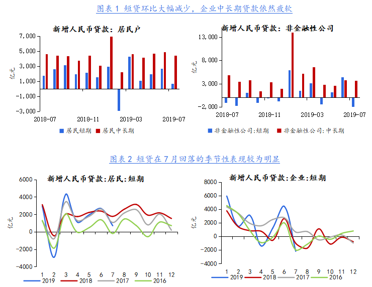 短貸季節(jié)性回落疊加需求疲軟使新增人民幣貸款承壓。7月金融機(jī)構(gòu)新增人民幣貸款1.06萬(wàn)億,同比少增3975億,環(huán)比大幅減少6000億。其中,短期貸款6月沖高之后季節(jié)性回落是重要原因之一,例如,7月住戶部門短貸僅新增695億,環(huán)比少增1972億,企業(yè)部門則更加嚴(yán)重,短貸凈到期2195億元,環(huán)比大幅少增6603億元。歷史上來(lái)看,短期貸款在多數(shù)年份表現(xiàn)出在二季度末沖高后大幅回落的季節(jié)性規(guī)律。