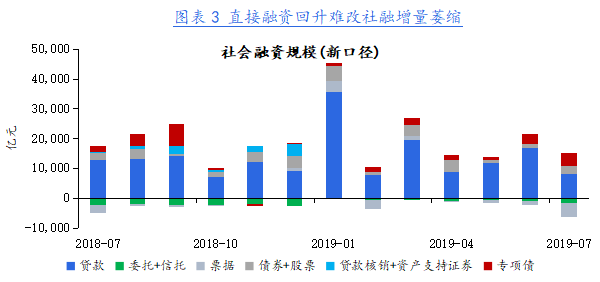 直接融資回升難改社融增量萎縮。7月社會(huì)融資規(guī)模僅新增1.01萬(wàn)億,環(huán)比大幅減少1.25萬(wàn)億。其中,直接融資成為唯一亮點(diǎn),地方專項(xiàng)債發(fā)行進(jìn)度繼續(xù)加快,7月凈融資4385億元、環(huán)比多增840億;企業(yè)債券凈融資2240億元、環(huán)比多增1,063億元;而受科創(chuàng)板新股集中發(fā)行帶動(dòng),沉寂已久的非金融企業(yè)境內(nèi)股票融資7月新增593億元,環(huán)比多增439.8億元。