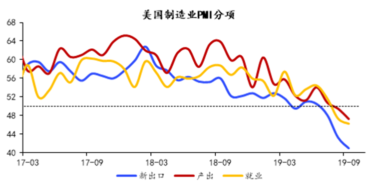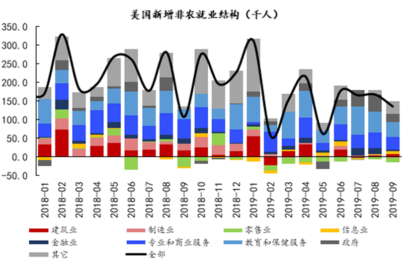 制造業(yè)PMI也已經(jīng)連續(xù)兩個月低于榮枯線,而三大分項新出口、產(chǎn)出和就業(yè)同步下行。雖然美國非農(nóng)就業(yè)增長仍然穩(wěn)健、10月ADP新增就業(yè)人數(shù)超預(yù)期達(dá)到12.5萬人、失業(yè)率保持歷史低位、總體向好,但結(jié)構(gòu)上看,新增就業(yè)主要集中在服務(wù)業(yè)和政府部門,制造業(yè)就業(yè)延續(xù)弱勢,美國制造業(yè)就業(yè)在貿(mào)易爭端之下壓力明顯增大,前期關(guān)稅對美國通脹的影響也已逐步開始顯現(xiàn)。