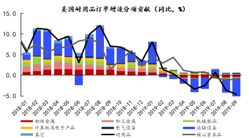 耐用品訂單來看,9月美國耐用品訂單環(huán)比下跌1.1%,創(chuàng)四個月最大跌幅;而同比下跌4.6%,為近三年來最大。除去國防和運輸設(shè)備的核心資本品訂單萎縮也已持續(xù)多月,顯示美國制造業(yè)的頹勢仍在持續(xù)。分項來看,運輸設(shè)備訂單降幅最為明顯,由波音一系列事故引起的飛機訂單下降是重要原因。