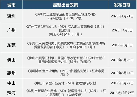 2019年和2020年,粵港澳大灣區(qū)各地政府陸續(xù)發(fā)布支持政策,在用地相對緊張、產(chǎn)業(yè)訴求較為強烈的珠江三角洲地區(qū),M0將成為政府招商的主戰(zhàn)場。
