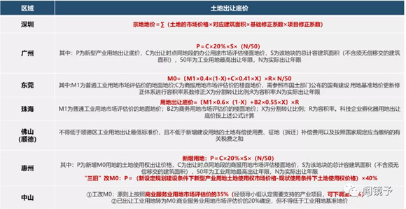 總結(jié)來說,深圳根據(jù)產(chǎn)業(yè)類型區(qū)別考慮;廣州惠州取同期同地段商服用地市場評估樓面地價20%;東莞根據(jù)自持比例取普通工業(yè)用地與商業(yè)服務業(yè)用地綜合后的40%,自持多則更偏向工業(yè)用地,自持少則更偏向商服用地。
