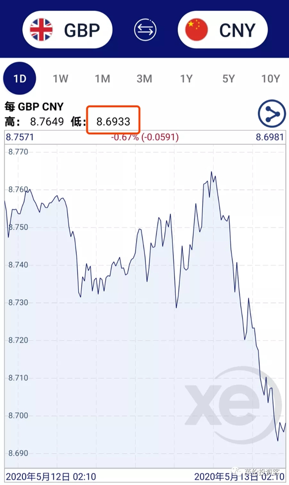 過去24小時,英鎊兌人民幣匯率更是急跌,剛剛瞬間從8.76跌到了8.69。