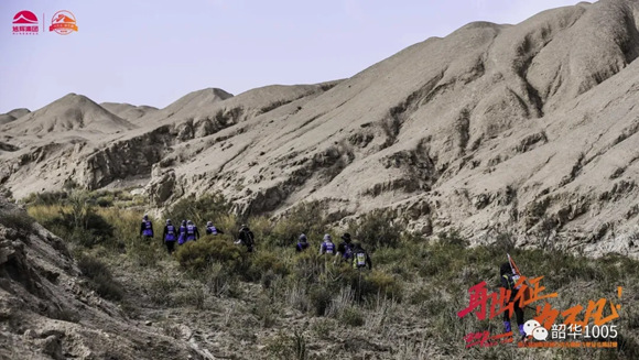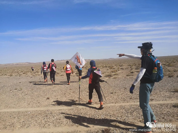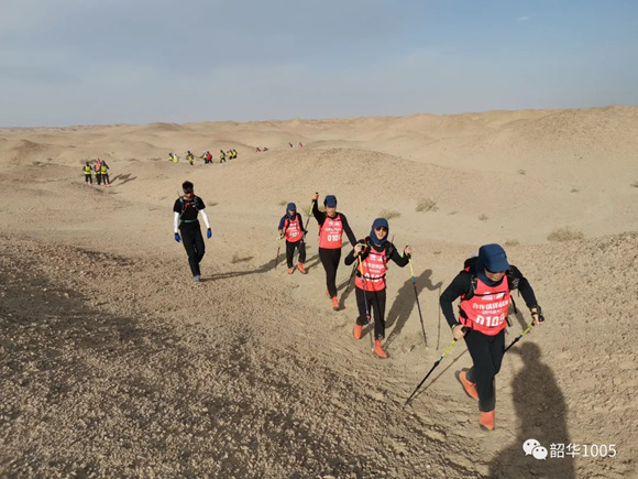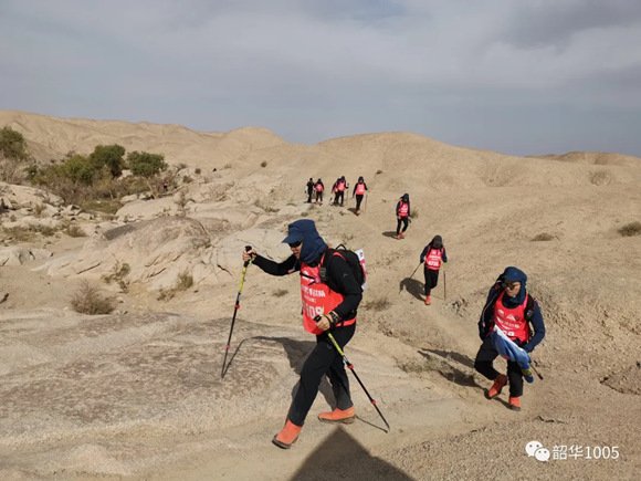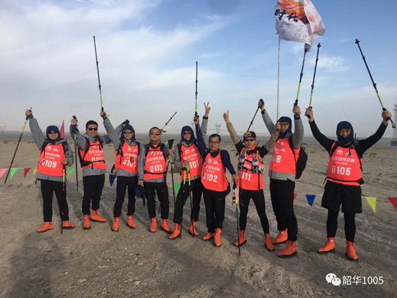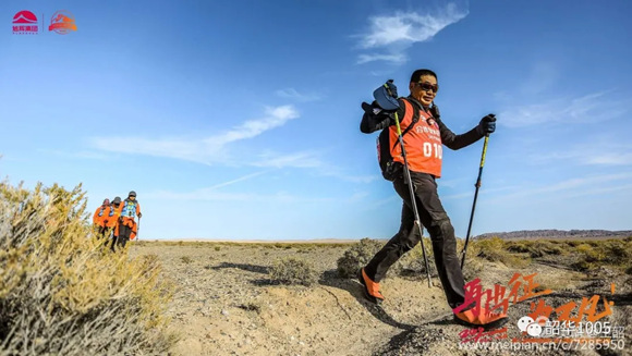 呯!主持人的一聲槍鳴,期待已久的“戈6”拉開了帷幕!33支戰(zhàn)隊、360位“戈友”象一位位枕戈待旦的勇士,迫不及待地魚貫而出,一雙雙堅毅有力的腳步踩在荒漠上,伴著登山杖撞擊荒沙,唰!唰!唰!像一首節(jié)奏感強(qiáng)烈的生命交響曲,響徹云霄,動人心弦、催人奮進(jìn)!也許如林中董事長所講:第一天激動又好奇,吹著喇叭唱著歌;第二天安靜了,因為體力透支,都是憑著毅力在走;第三天死的心都有,靠的是靈魂和信仰;到了第四天,就看到了希望。的確,第一天各支戰(zhàn)隊都恨不得用上洪荒之力,卯足勁兒往前沖,你追我趕,揚起身后的荒沙留下一片片濃濃的黃煙、一串串又長又深的腳印……