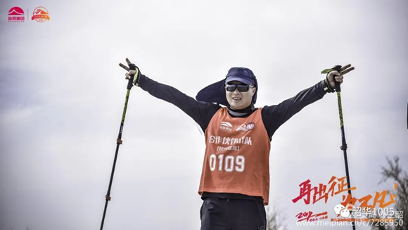 其實,第二天才是真正挑戰(zhàn)和考驗的開始,頭天的體能消耗,還有更漫長的38公里,且背沙包負(fù)重前行,想想心里都不禁發(fā)毛!本來就不輕松,老天爺卻偏偏故意和我們作對,瘋狂了一個夜晚的寒風(fēng)沒有任何停息的跡象,撲面而來利如刀刃,把我們吹得左搖右晃,步履蹣跚。“鬼子帽”、頭巾和沖鋒衣把我們裹得嚴(yán)嚴(yán)實實,睜眼和呼吸都變得異常艱難,每邁出一步都相當(dāng)費勁!堅持、加油,隊友的鼓勵和登山杖成了我們重要的精神支柱……,最終,我們第十九個沖過終點。