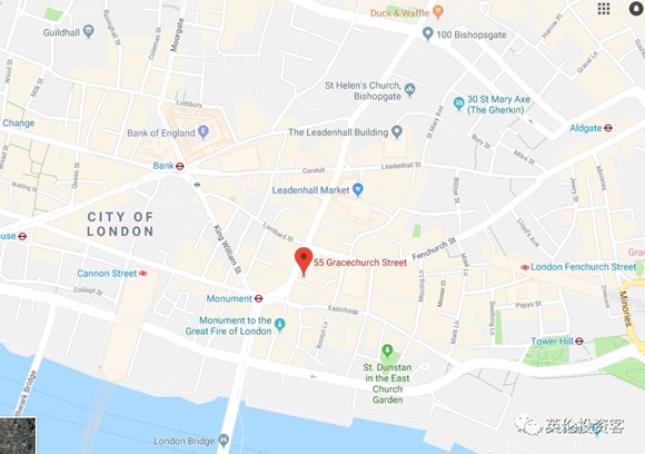 圖為大樓位置,位于倫敦金融城,靠著倫敦大火紀(jì)念碑和利德賀市場(chǎng)