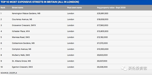 比如像Kensington Palace Gardens這樣排名第一的富豪街,平均總價(jià)已經(jīng)沖到了超3億人民幣的天價(jià)。