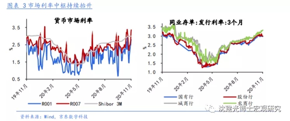 三是6月以來市場利率中樞持續(xù)抬升。上半年央行通過全面降準(zhǔn)、再貼現(xiàn)再貸款等工具向市場投放了大量流動(dòng)性、資金面極其充裕,R001在四五月份一度降至0.75%左右。6月以來貨幣政策由前期“極度寬松”逐步轉(zhuǎn)向結(jié)構(gòu)性發(fā)力、精準(zhǔn)滴灌,央行一面通過引導(dǎo)金融體系讓利等形式推動(dòng)降低實(shí)體融資成本,一面在公開市場操作方面趨于謹(jǐn)慎、控制流動(dòng)性投放。至11月初,市場利率中樞較前期已明顯抬升,R001和R007均升至3%左右、無風(fēng)險(xiǎn)利率10年期國債收益率接近3.3%,同業(yè)存單發(fā)行利率自6月以來也一路上升、目前3個(gè)月品種已升至3%以上。