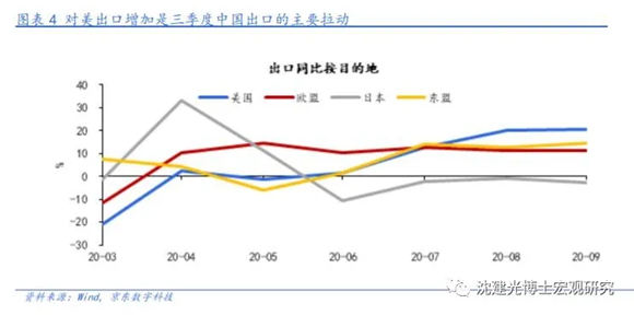 更進(jìn)一步,美國需求回暖對中國出口的提振明顯。三季度中國出口創(chuàng)季度新高,同比增速為8.8%,對美增速較高是主要拉動。例如,7月中國對美出口增速達(dá)到12.6%,8、9月中國對美出口增速更是超過20%,美國疫情導(dǎo)致國內(nèi)供應(yīng)鏈不暢,需求旺盛對于拉動近來中國出口貢獻(xiàn)顯著。