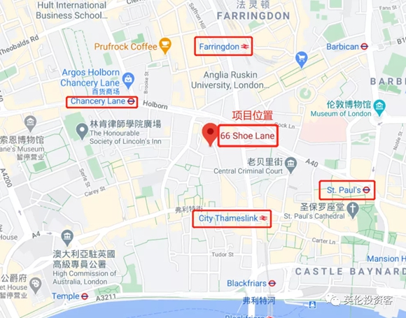 德勤大樓(Athene Place)地址為66 Shoe Lane,位于倫敦老金融城靠近西區(qū)的位置,對面就是高盛歐洲總部大樓,離圣保羅大教堂也很近,步行可達Farringdon、City Thameslink火車站和St. Paul‘s、Chancery Lane地鐵站,交通十分方便。