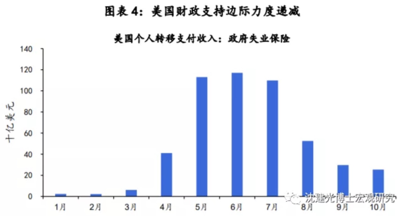 展望后市,消費對兩國經(jīng)濟復蘇可持續(xù)性甚為關(guān)鍵。從美國來看,消費強勁態(tài)勢能否持續(xù)還需要受到如下因素左右:一是美國疫情控制情況。10月以來,美國遭遇第三波疫情,日新增確診平均達到春季第一波疫情高峰時的2.5倍。進入12月份后,美國僅僅5天就新增了超過100萬確診病例。疫情居高不下,或?qū)阂指呔€下接觸、低附加值服務(wù)業(yè)的復蘇,對線上化程度較高行業(yè)沖擊較小;二是財政刺激的邊際效用遞減。下半年來,美國個人收入中來自于政府失業(yè)保險的收入逐月回落,10月回落至255億美元,是6月救助最高峰時期的五分之一。在疫情未得到明顯控制下,財政力度也將直接影響未來消費。