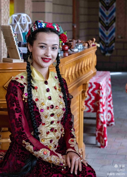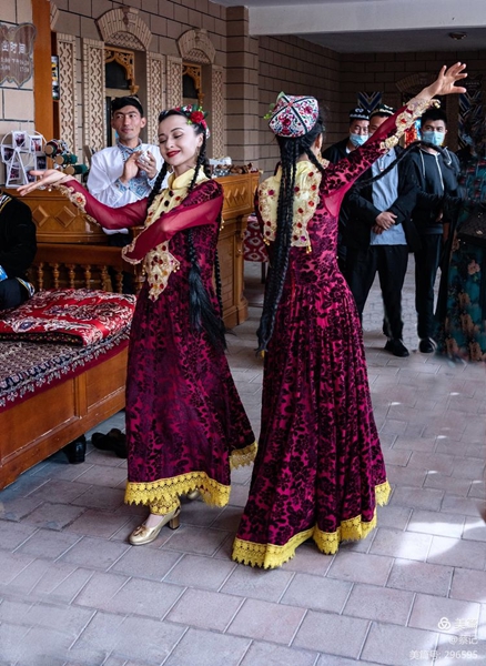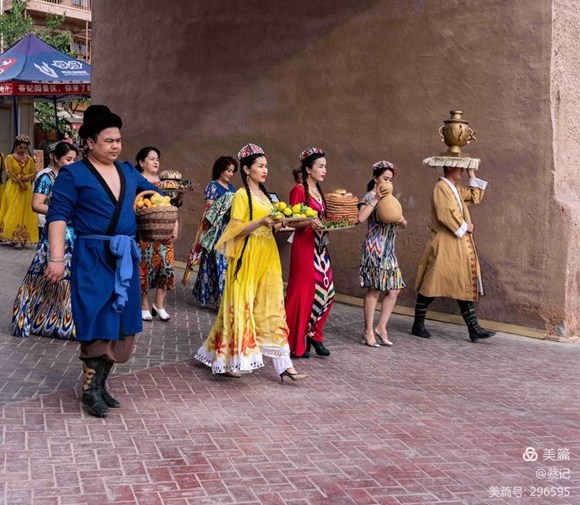 身穿各族鮮艷服飾的大叔和姑娘們手捧水果、馕餅、朵帕(維吾爾族花帽)等特產(chǎn),或是頭頂茶炊用具出場(chǎng),歡迎四方來(lái)客。