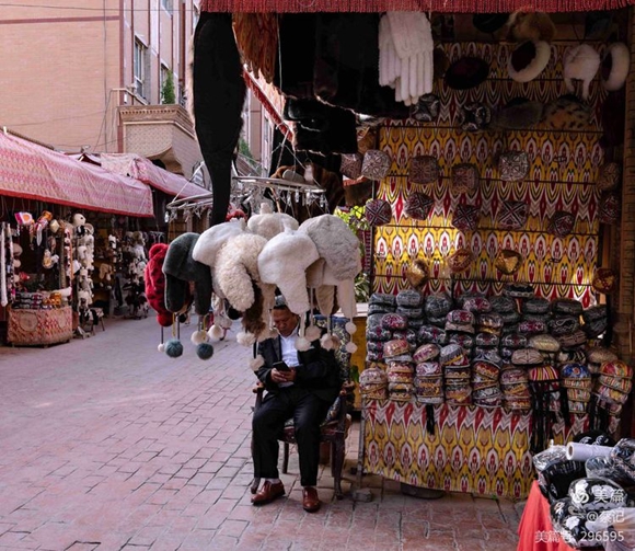 帽子巴扎。號(hào)稱“百年帽街”,是喀什帽子工匠的薈萃。