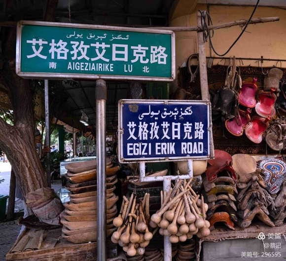 老城里的路牌用維、漢、英(或漢語(yǔ)拼音)三種文字書(shū)寫(xiě)。與漢語(yǔ)不同的是,維吾爾文從右向左閱讀。