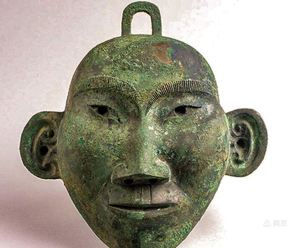 試比較同是商代晚期在河南安陽殷墟出土的青銅人面,橢圓臉杏眼低鼻梁、臉部平緩、神情平和,與今天東亞人相差不大。