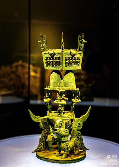 青銅神壇高53厘米,分三層。底層神獸代表地界,中層是人間,上層代表神域天界??蓮纳駢Q探古蜀先民的信仰,理解他們對天地、自然、神靈、人世的認識體系。