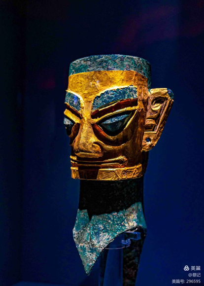戴金面罩的青銅人頭像更顯尊嚴高貴,氣度不凡。