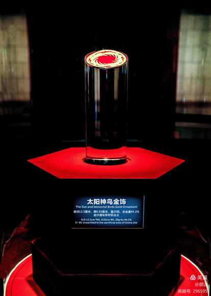 太陽神鳥金飾在射燈照耀下金光燦爛,熠熠生輝。