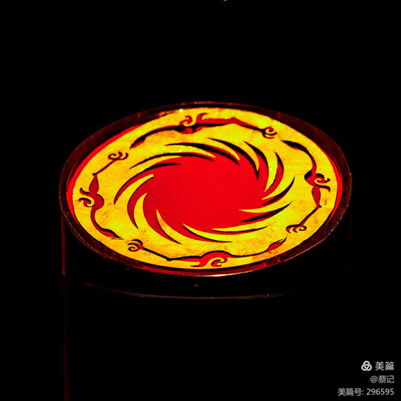 鏤空表現(xiàn)的圖案分內(nèi)外兩層。內(nèi)層是等距分布的12條弧形齒狀芒飾,順時針旋轉(zhuǎn);外層有繞日的四只神鳥,逆時針飛翔,再現(xiàn)“金鳥負日”的神話故事。